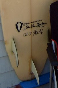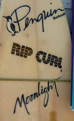 I recently spotted this old Moonlight board at a souvenir shop in the touristy section of Oceanside Harbor. It’s an early 1980’s Dan Van Zanten thruster under his Penguin label. It may have been made for the Rip Curl surf shop or for a Rip Curl team rider, I’m not sure what “Old Skull” written by the fins is supposed to mean.