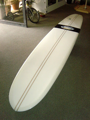 This is one of those boards that come through the shop that make me stoked on longboards. Nice handshape by Mike Slingerland, twin stringers, volan glass, custom tailblock and a badass looking band wrapping all the way around and Slingerland’s classy Japanese wave logo. *drool*