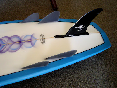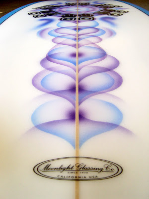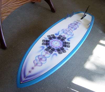 This is one of the boards we had in our Sacred Craft booth, 5 fin Bonzer “Bumble Bee” model. 5’10” length 20 1/2″ width 2 1/2″ thickness Handshaped by Malcolm Campbell. Airbrushed by Peter St Pierre. Reverse layup resin tint deck. Wetsand gloss speed finish. It’s for sale *SOLD*