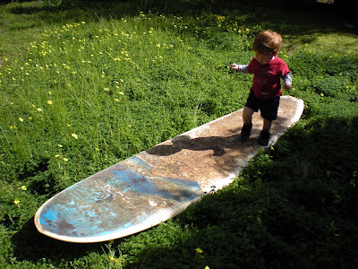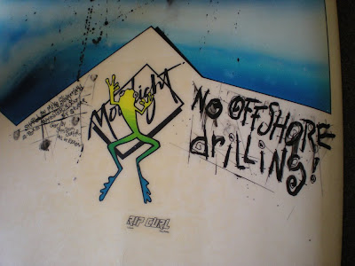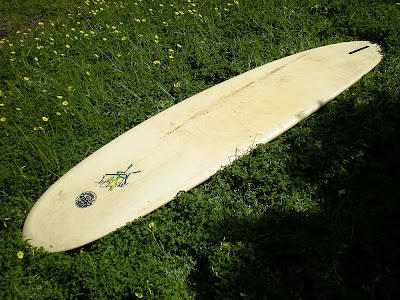 In 1989, shortly after the Exxon Valdez oil spill, my Dad Peter St Pierre hotwired a big chunk of styrofoam into a surfboard blank and had Mike Slingerland shape it into this longboard. Gary Stuber glassed it with epoxy resin. My Dad rode it a few times and felt the board was too light, especially in offshore winds, so it was resanded and then glassed a second time with polyester resin. He added this groovy artwork, surfed it for the rest of the summer and then the board was retired to the garage where me and JM dug it out last weekend. My Dad somehow got all that crusty wax off the next day.