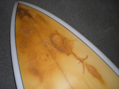 I think the airbrush is a commentary on the wheels of time rusting to a halt as surfing is timeless. Or, that Bonzers have always been ahead of their time and threw a monkey wrench into the world clock. Or, man’s technology and dominance over nature is a farce like the ocean eating away at a once might vessel. Or, some sort of classic Campbell Brothers cosmic time warp mind trip. Or somebody is a Dr Who fan.