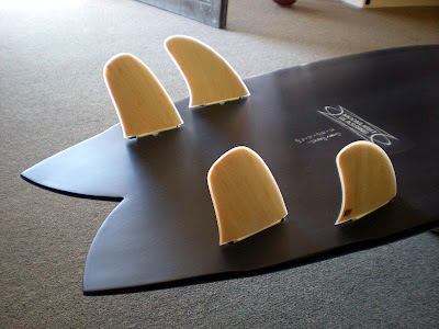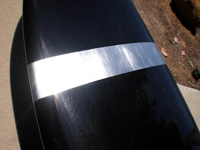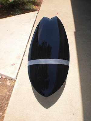 Silverleaf competition band. Polished deck and rails, wetsanded gloss bottom. Removable bamboo fins. Shaped by Gary Hanel.