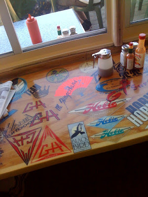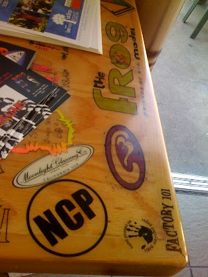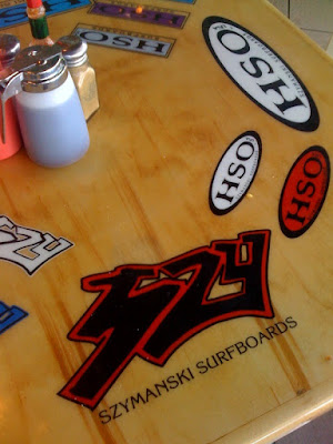 Brian Syzmanski of Encinitas did a pretty cool project for Pipes Cafe in Cardiff-by-the-sea. He went around to the local glass shops and grabbed a bunch laminates of the logos of the many shapers and surfboard companies in California. Next time you are in Cardiff have lunch or breakfast at Pipes, pull up a chair and think about your ordering your next custom surfboard from the deep talent pool we are blessed to have here.