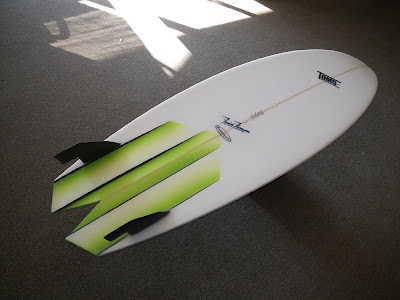 hey guys, all my models are handshaped so it is just a matter of scaling up any particular design to suit the rider and their abilitys. As for the fins, they are a result of concepts for reducing the drag on the fins without comprimising the conrol or drive. The leading edges have 2 specific purposes. 1. drag reduction (higher potentiual top end speed). 2. they alow the fin to turn sharper arcs or even angular turns on the wave. the key to the successfull function of these fins are tips are super flexible so that they will hold the laminar flow without cavitation, the end result is a fin that will turn sharply whilst providing rapid acceceleration through the turn.