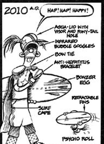 odd files egg art bonzer 2010 A.D. By Surfy SurfyJanuary 1, 20107 Comments As predicted by Wilbur Kookmeyer creater Bob Penuelas back in 1986, 2010 is the year of the Bonzer Egg. Don’t forget your surf cape. Hap! Hap! Happy! Surfy Surfy Online Store! 7 Comments Surfy Surfy Posts by Surfy Surfy previouslyMoon Kitty says thanks… up next Your Modern Surfy Family Leave a Comment Cancel replyYour email address will not be published. Required fields are marked * Save my name, email, and website in this browser for the next time I comment. Notify me of follow-up comments by email. Notify me of new posts by email. Δ 7 Comments Anonymous January 1, 2010 That’s so great. He nailed it. Reply e. January 1, 2010 Well, its good to know I was ahead of the curve in some respects. Guess now I need to go buy my cape. Reply RLS January 1, 2010 Sweet, I got my egg early. Does SurfySurfy stock bow ties? Reply tyler January 1, 2010 I remember trying to get ‘hap hap happy’ to catch on when that comic came out. Maybe now it will… Reply Anonymous January 2, 2010 Actually, the other really funny thing is that I see more and more people out in the water with hats (and not just trucker hats) and those surf shade sunglasses. Kookmeyer was a prophet! Reply Anonymous January 2, 2010 Kookmeyer, of course . . . I knew I had seen that cartoon before. I think I recall the original in some surf mag or another. I don’t really want the bonzer, but would like the anti-hep bracelet and retracable fins. Reply Anonymous January 3, 2010 your loss on the bonzer, dude. Reply