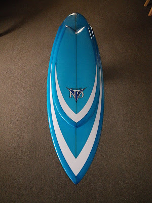 This is a good application of the e-wing on the Mini-Merk Bonzer5 model, pulling in that wide tail but keeping that sweet hip. Nice and light blue 4 oz resin tint. White wishbone airbrushed on the hotcoat. Gloss and polish.