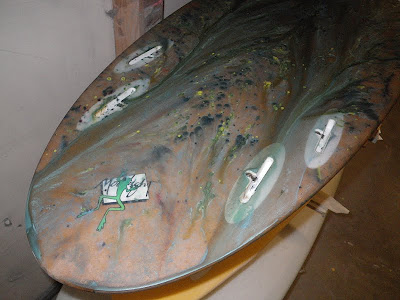 A lot of people these days milk the “surfer/artist” vibe but John Moseley is the real deal. He’s been scratching out an existence as a dedicated artist for decades. Today he showed up with his repainted Pavel bio-foam quad. We are hoping it glosses out.