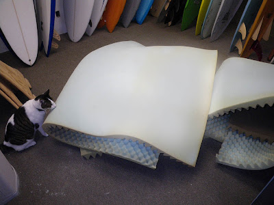 Moon Kitty inspects the foam pads we use in the van to transport shaped blanks.
