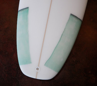 This board has interesting rail patches at the tail which are printed fiberglass.