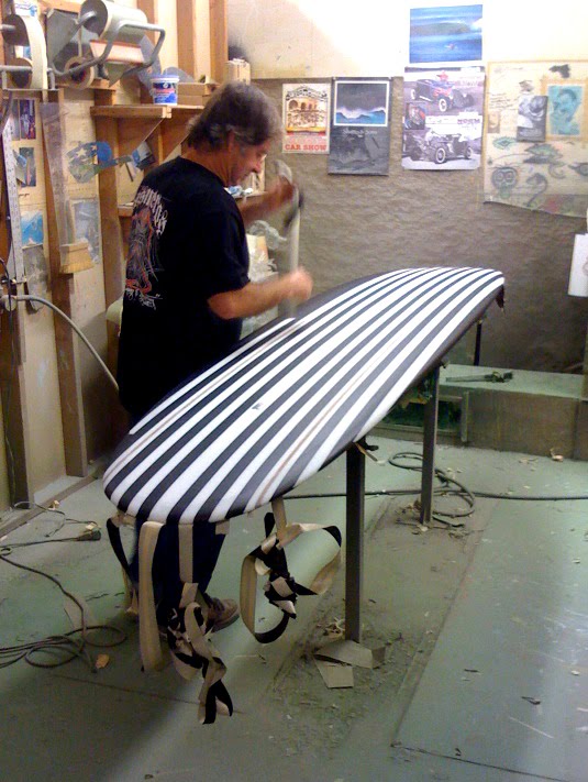 Hobie One Fin Pin model featuring lots of striping by Peter St Pierre and hand drawn foam logo by Tyler Warren. Shape by Terry Martin. Photos swiped from Moonkitty Meow’s Facebook page.
