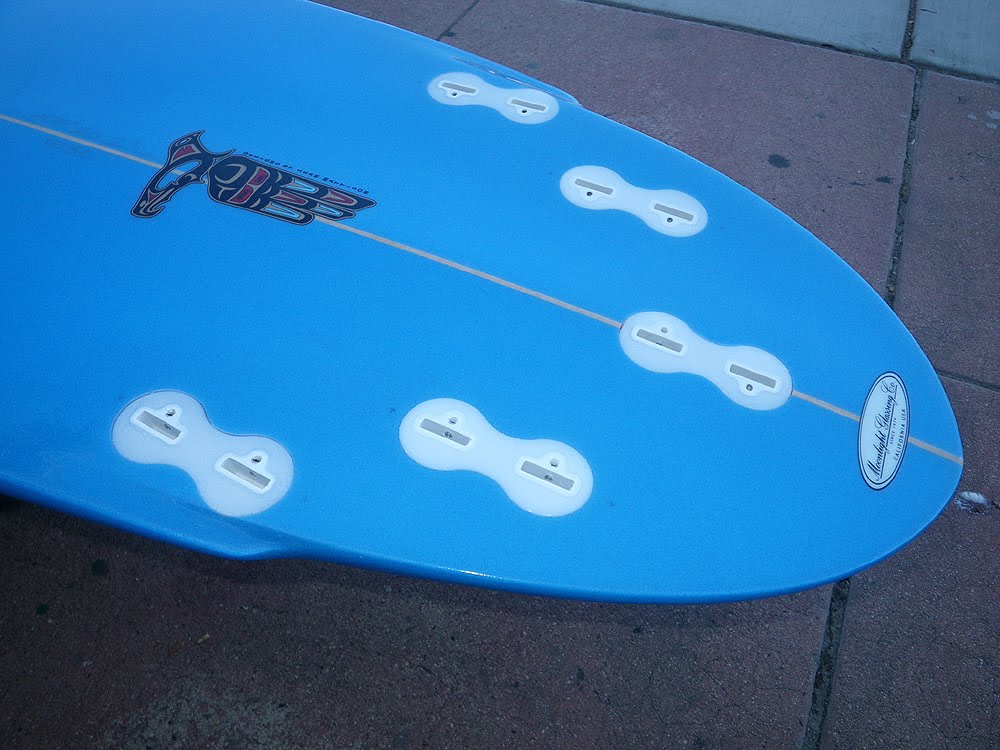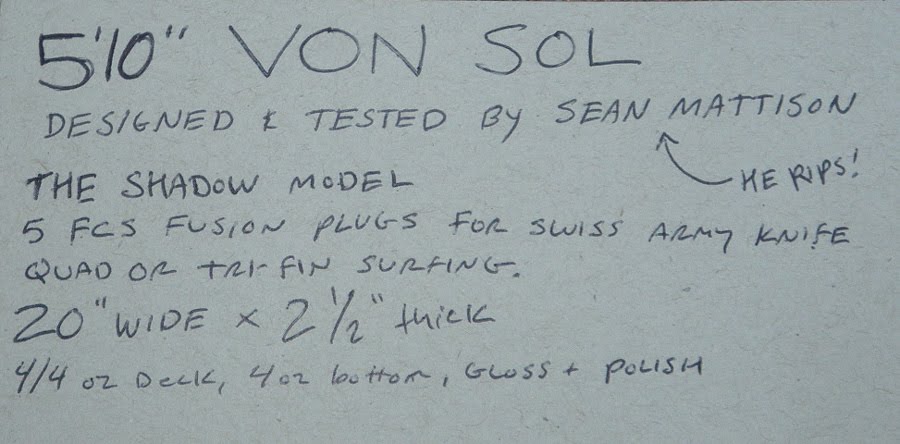 This is a new surfboard label that is getting some attention. Von Sol by Sean Mattison. Sean was on the Moonlight Glassing surf team when he was a grom back in the early 1980’s when he was tearing up the east coast contest circuit. We have 5 of these “Shadow” models in stock at Surfy Surfy Surf Shop. They are pretty interesting. 5 fin boxes and a little micro e-wing. Sean is combining his love for Fish surfboards and shredding into this handy little package.