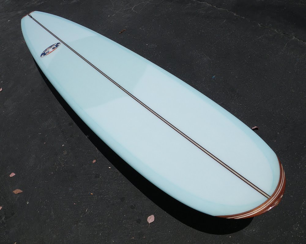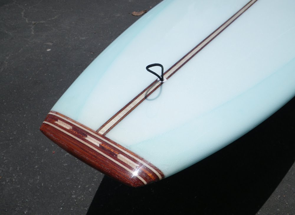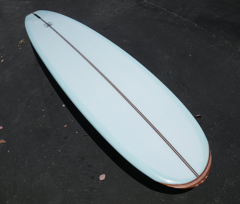 I love, love this longboard. Handshaped by Mike Slingerand in Encinitas, California. Cool ice blue tint with knee patch by Gary Stuber. Crafty nose and tail blocks by John Peugh. The t-band stringer is pure class.