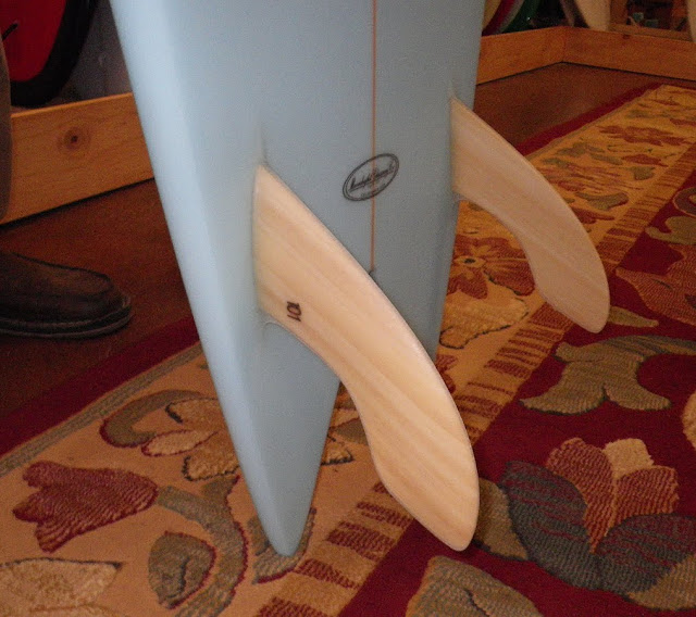 This blue one is 5’5″ X 20 1/2″ X 2 1/2″ with glass-on bamboo fins. Ride these boards 6″ to 8″ inches shorter than you are tall.