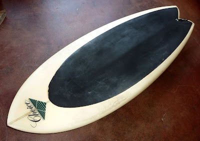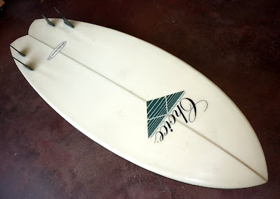 Here is a pretty cool artifact from the early 90’s, this snazzy kneeboard shaped by Rich Pavel under his Choice label and glassed at Moonlight Glassing. One of the first summers I worked at Moonlight full time handsanding for Kenny I remember sanding a lot of these Choice fishes and kneeboards with glass-on fins. They seemed like little UFO’s at the time. It’s kinda funny now how just about everyone has a modified kneeboard in their quiver. These boards were once the most obscure craft in the surfing universe and now the Fish is everywhere.