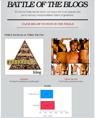 The polls have closed and Korduroy.tv has edged out Follow the Fish for the win in Surfer Magazine’s Battle of the Blogs.