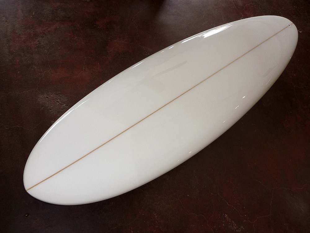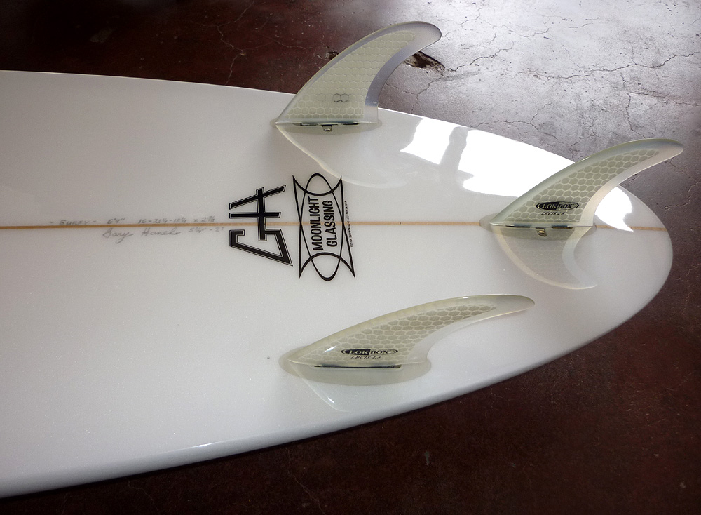 Check out this ultra clean collaboration between shaper Gary Hanel and the Moonlight Glassing surfboard factory. The immaculate outline is complimented by GH’s performance rails and rocker. This board features a snazzy 4 oz volan deck patch and is finished off nicely by the polished gloss. The new Micro-Box fin system makes it travel ready.