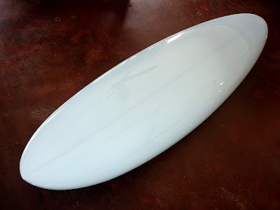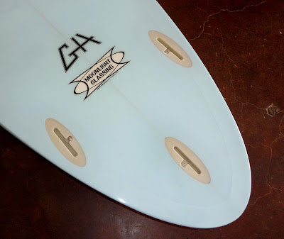 Gary Hanel has been shaping some sweet little performance eggs lately. A fine example is Little Bluey here. It’s 6’4″ x 21 1/4″ x 2 3/4″. Little Bluey has modern foiled rails, a pulled in nose and some nice kick in the rocker so you can shred it in beachbreaks and good waves.