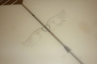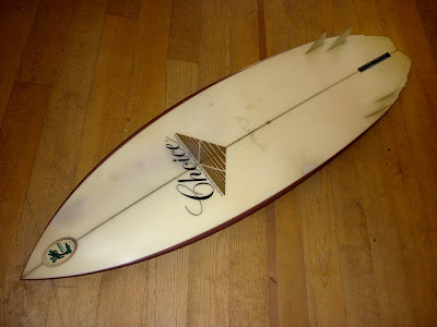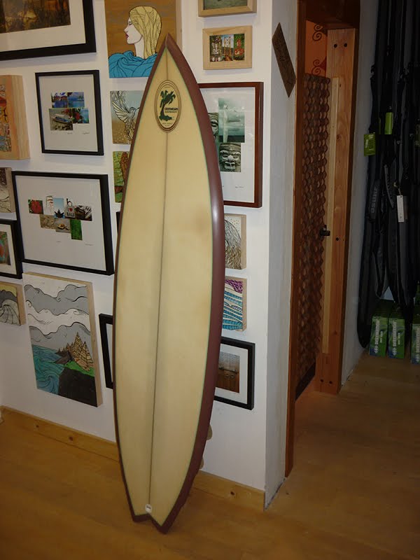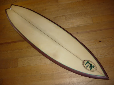 Over the summer I bought this used beat up 1990’s 6’3″ Choice Bonzer and had it rebuilt by Jimmy Robertson, who did about $100 bucks worth of repairs on it.