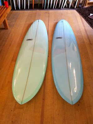 Two cleanly foiled 8’0″s for Surfy Surfy Surf Shop. Handshaped by old school guru Mike Slingerland in Encinitas. Coke bottle green and blue resin tints.