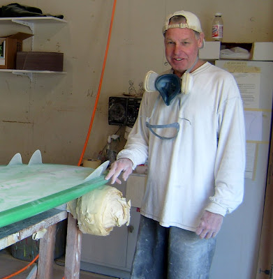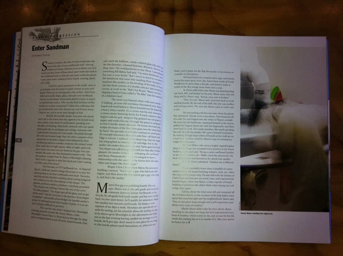 Vol 20 issue #2 of The Surfer’s Journal has a cool feature on Moonlight Glassing’s surfboard sander Kenny Mann written by Kimball Taylor. Kenny has sanded over 100,000 surfboards and specializes in the tricky stuff like channel bottoms, glass-on fins and Bonzers. Kenny moves fast hence the blurry TSJ photo so here is a file photo.