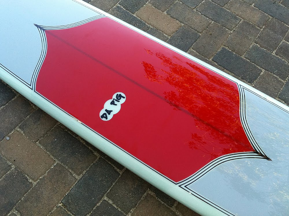 Here is a unique one for the longboard fans. 10’3″ Pig handshaped by underground old school soulman Bruce King. This puppy is loaded with features: volan glass, deck panel and pinlines, custom hatchet fin by Fins Unlimited, diamond wood tail block, and Bruce’s unique “Nose Blower” double concave for serious tip riders. The Pig outline features a nice hip for rotating cutbacks. It’s over 10′ but this ain’t no plank.