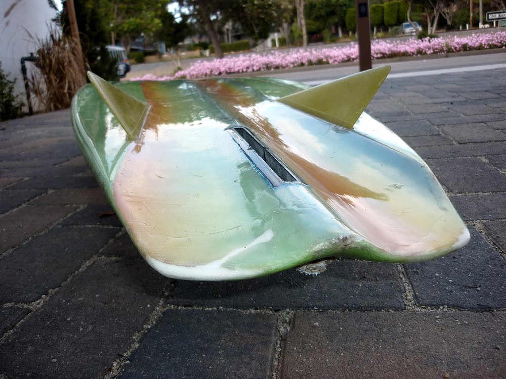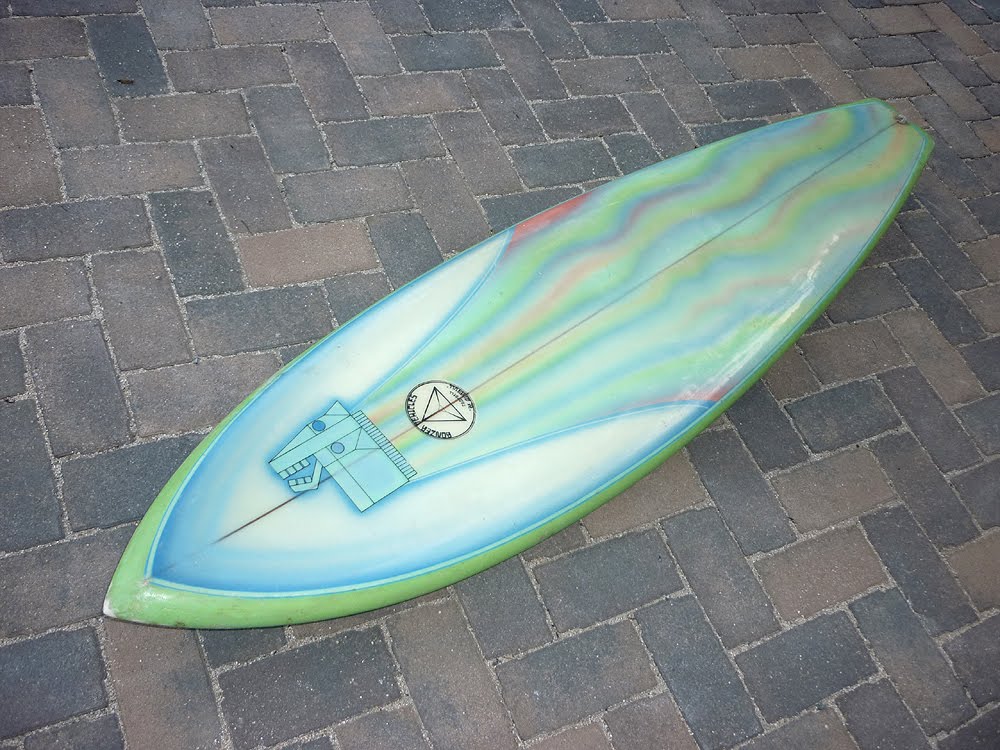Friend of Surfy Surfy Mark buys and sells lots of unique vintage surfboards. A couple of years ago he came across this incredible Campbell Brothers Bonzer Light Vehicle. Glassed and airbrushed by one of the original Bonzer test pilots Cliff Collinge. It’s a safe guess the art is a tribute to the famous 1973 play or 1977 film adaption of Equus (I confess to have never seen Equus and knew little about it before looking up the linked Wikipedia page. The story sounds a bit creepy but I am digging the equine godhead theme art).