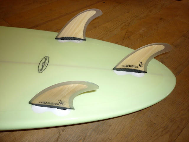 Standard tri-fin with FCS Fusion system. Shown here with the new Scarfini fins from South Africa. Bamboo and carbon combo.