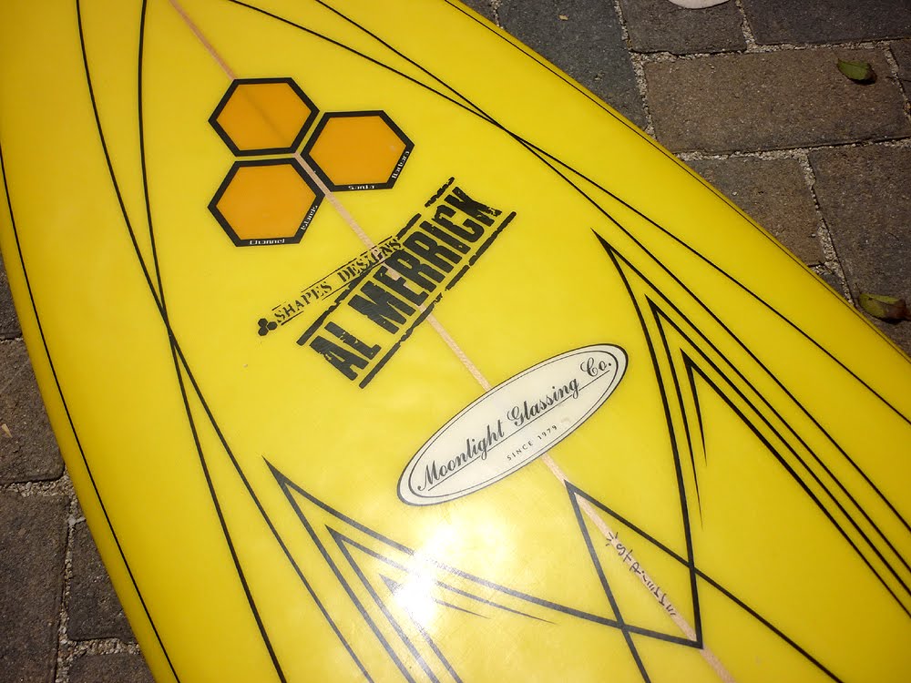 The large Moonlight Glassing oval is super rare, especially on a Channel Islands who later became pretty strict about keeping the glass shop logos minimal and on the bottom of the board only.