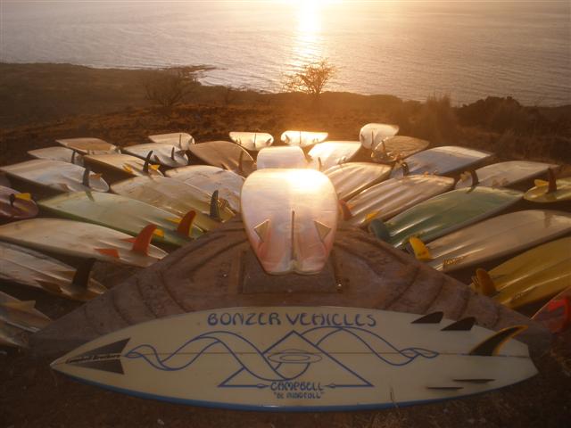 July 31, 2011Mahalo nui! …to all my friends that helped me along the way to achieve my vision of putting together the “Evolution of the Bonzer” quiver as a 40th Anniversary Tribute to the Campbell Brothers, who are ever so deserving and have shared so much freely with all of us and have changed our lives with the Bonzer Surfboard. This has been many years in the making and I’m so blessed amd stoked that I have a great crew of friends that helped me get all of the Bonzers up to the Pu’u at Makalawena, Big Island Hawaii…such a magical & spiritual place to me & a huge endeavor that I wouldn’t have been able to pull off by myself…mahalo nui & much aloha to Cole, Ben, Mike, Mark & my daughter Melia!