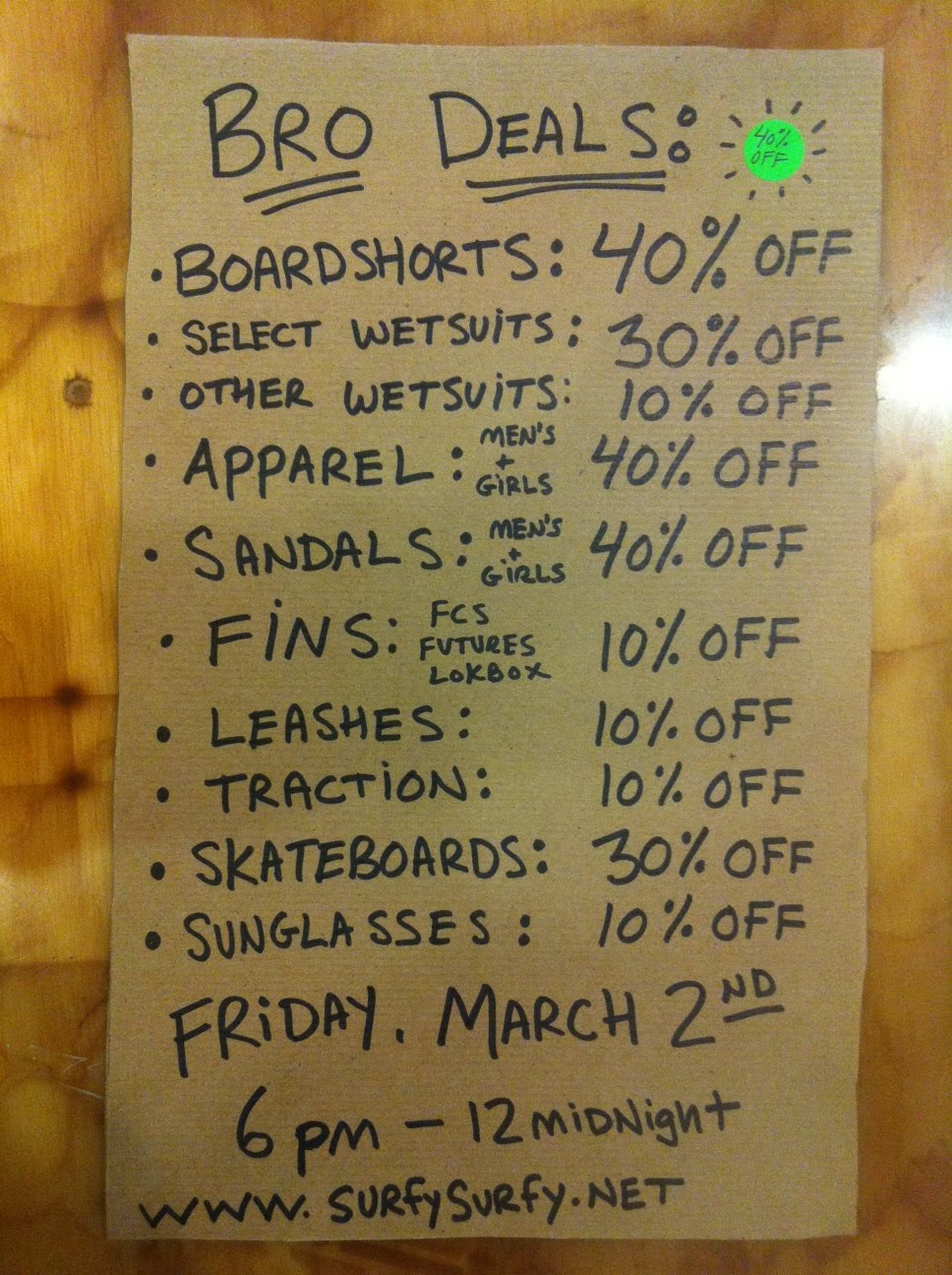 Surfy Stuff Bro Deals Galore! By Surfy SurfyMarch 2, 20121 Comment Super rad mega sale at Surfy Surfy Friday March 2nd. Live music! Drinks! Snacks! Hooray! Surfy Surfy Online Store! 1 Comment Surfy Surfy Posts by Surfy Surfy previouslyMandala Flex Tail Tri-Fin up next Blind Surfer Derek Rabelo Surfing Pipe Leave a Comment Cancel replyYour email address will not be published. Required fields are marked * Save my name, email, and website in this browser for the next time I comment. Notify me of follow-up comments by email. Notify me of new posts by email. Δ 1 Comment Anonymous March 2, 2012 I’m in bed at 8pm for dawn patrol the next morning. Good luck on the sale. Reply