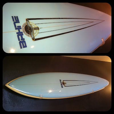 Stopped by Fins Unlimited in Encinitas today. Bill Bahne has this nice original Bahne surfboard shaped by Steve Moret hanging on his office wall.