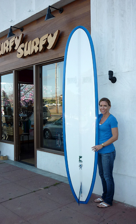 Surfy Surfy Surf Shop manager “Surfy Summer” and her new custom deluxe 9’4″ triple stringer shaped by Rich Pavel. Reverse layup resin tint by Gary Stuber at Moonlight Glassing. Surfy Summer is 5’6″. Look for her surfing her new board mornings before her 12 hour shift with no breaks at Surfy Surfy.
