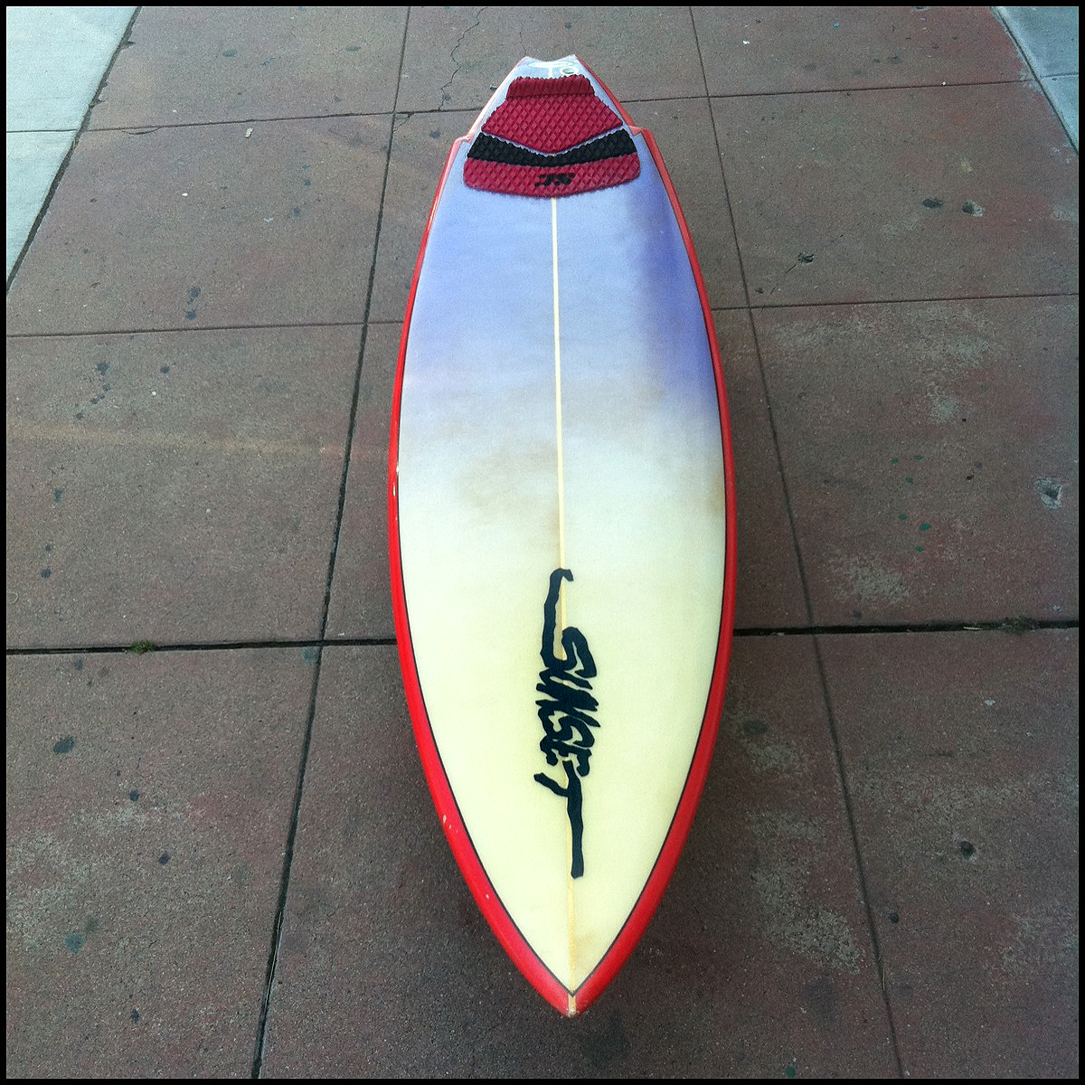 This beat up but still functional Sunset Surfboards 5 fin e-wing Bonzer came thru the shop recently.