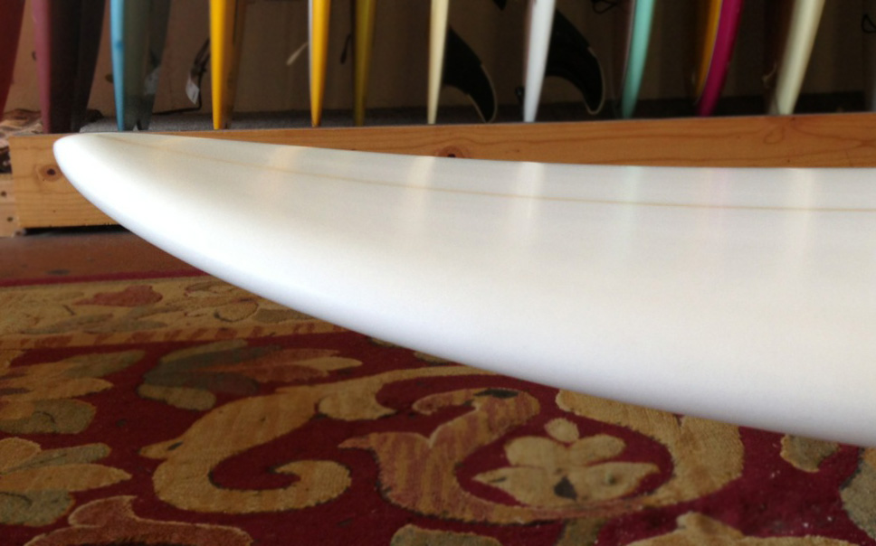 This 6’0″ is pretty sweet. Nice and light for the volume. 4oz volan deck patches have become standard for us. Wetsanded gloss, no color. Note the nose thickness (see photo 5).