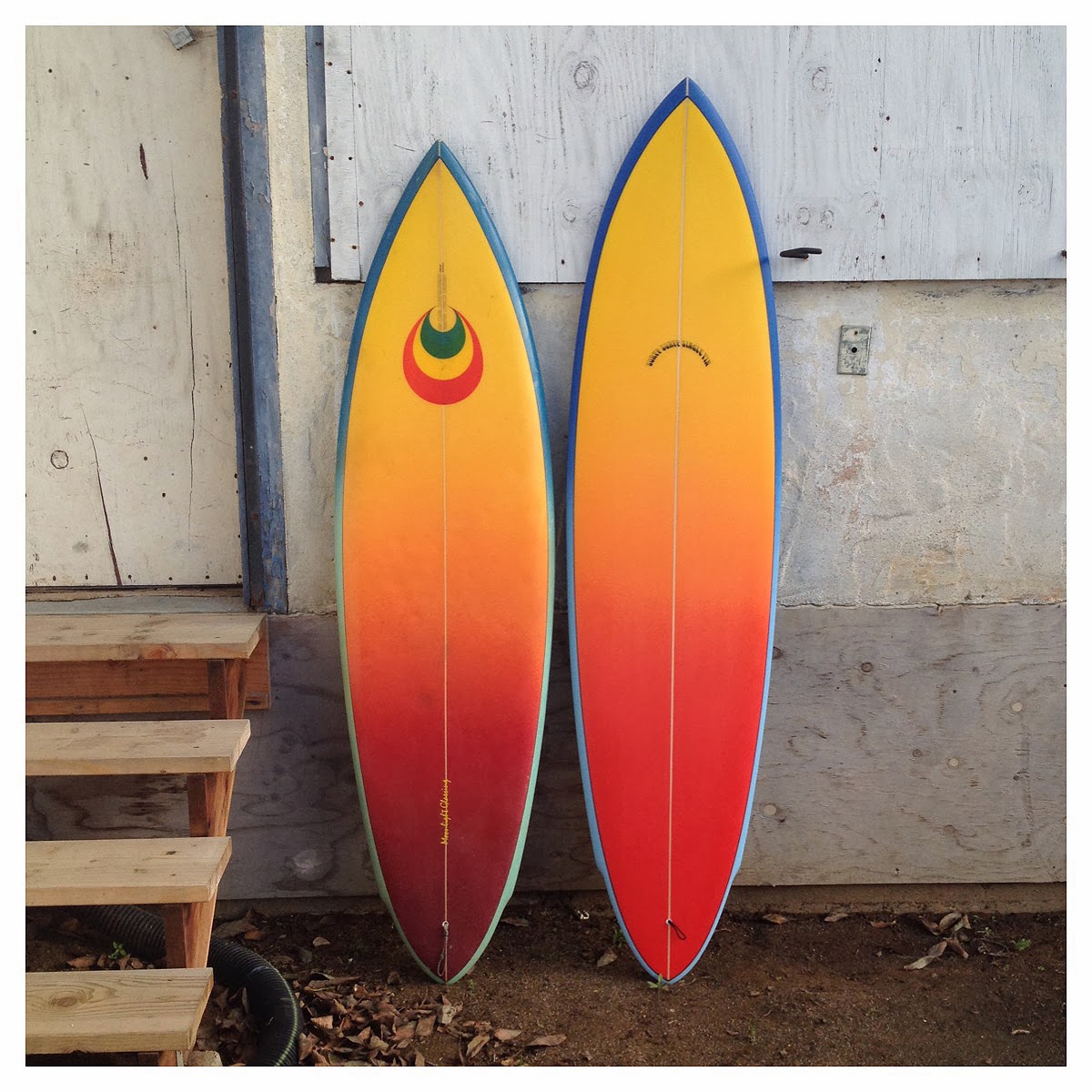 | Inspired by my 1979 Wayne Lynch (left) gifted to me by Steve from the Central Shaft blog, I commissioned our local guru Mike Slingerland to shape us some new wing pin single fins. 35 years later airbrushed by the same man, Peter St Pierre. . |